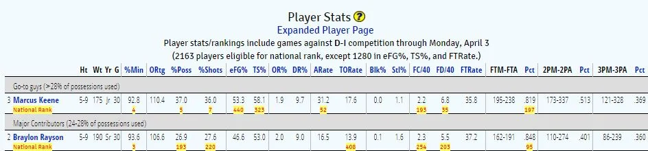 The departure of both Keene and fellow minutes-eater Braylon Rayson leaves Central Michigan with a Marianas Trench-sized hole in the backcourt. Think that’s an absurd statement? Well, Keene and Rayson played the 3rd- and 4th-highest share of minutes in the entire country: