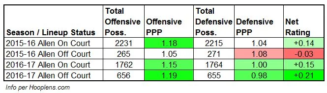 Allen is the lone returning lineup mainstay, and my hunch is that he’ll ascend back to the offensive alpha dog status of 2015-16. Duke experienced a strange statistical boost without Allen on the floor last year, compared to his All-American '15-16 campaign, when he was indispensable: