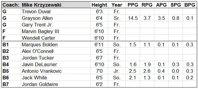 All of this means that Coach K won’t have to resort to junk zones in an attempt to confuse opponents, something he’s had to do more than he’d prefer in recent history. The Tucker-at-the-four lineup I mentioned may have issues if the opponent has two strong post players, but teams of that ilk are rare in college hoops, so it should be a manageable hurdle.
