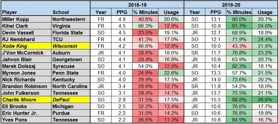 A couple caveats: Charlie Moore transferred from Kansas to DePaul, so he doesn’t really count. It’s hard to include Kobe King, either, considering he abandoned ship in Madison right before the Badgers became a Big Red Machine. The other 14 guys, though, are exactly what we’re looking for: major conference players who saw a rise in both minutes and opportunity, resulting in a major leap in production from year-to-year.