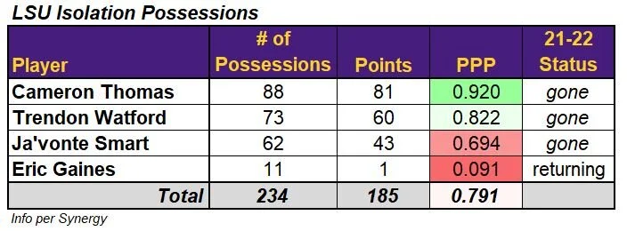 And those three were indeed responsible for most of the offense. Per Synergy, LSU ranked 2nd in possessions finished via isolation, and it was almost all via that trio: