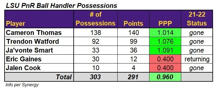 Similarly, even though pick-and-rolls are not a massive portion of the Tiger offense, Smart, Thomas, and Watford take essentially all of the Tigers’ experience in that department with them as well: