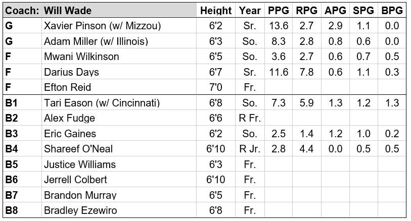 Key Newcomers: Adam Miller (Illinois), Xavier Pinson (Mizzou), Tari Eason (Cincinnati), Efton Reid, Jerrell Colbert, Brandon Murray, Justice Williams