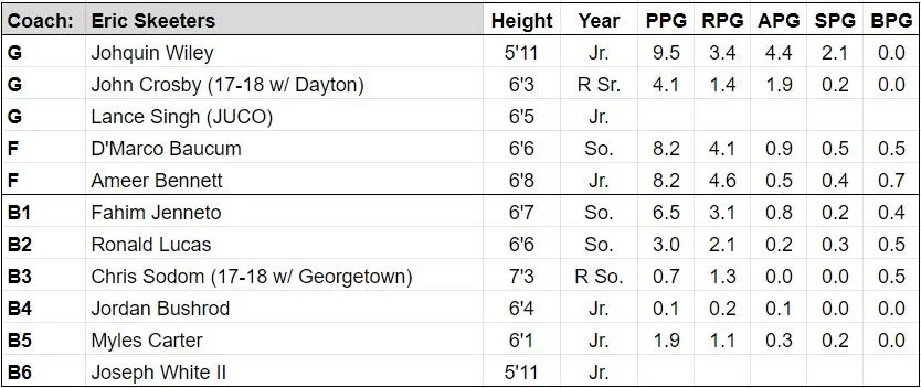 Key Newcomers: Jermaine Bishop (SLU), Kashaun Hicks (CCSU), Devante Carter (JUCO), Daryl Anderson, Spirit Ricks (JUCO), Tyrese Jenkins, Efstratios Kalogerias (JUCO), Yoro Sidibe, Nyzaiah Chambers