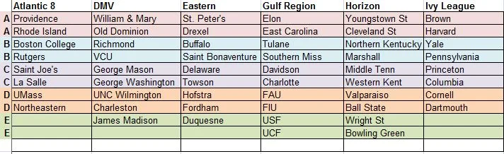 First and foremost, changing the Atlantic 10 (and its 14 teams) to the Atlantic 8 felt weird. That conference is now a bit unbalanced, but a lot of the Original 13 Colonies-area of the US became ultra-jumbled and ultimately hard to balance out - I did my best with the demands of the rules I arbitrarily made!
